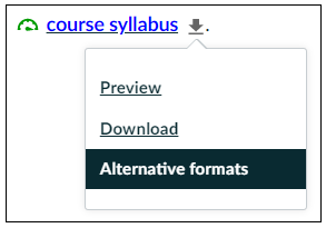 Since it takes a while to fully update all your files, Ally is already at work behind the scenes with a temporary solution for your students. Without any intervention from you, students are able to download more accessible, alternative formats of your Canvas pages and documents. Note that while the alternative file types are great for delivering content to students in a format that works for them, the result can also be dependent on the accessibility of the original document. When clicking on the arrows, students see options like these, depending on the file: